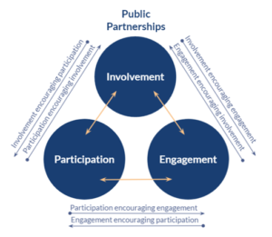 Public Partnerships is made up of three areas: involvement, engagement and participation. These areas are all connected. Each of these terms is in a circle, and they are arranged in a triangle. Arrows go between each circle. Involvement encourages engagement, and engagement encourages involvement. Participation encourages engagement, and engagement encourages participation. Involvement encourages participation, and participation encourages involvement.
